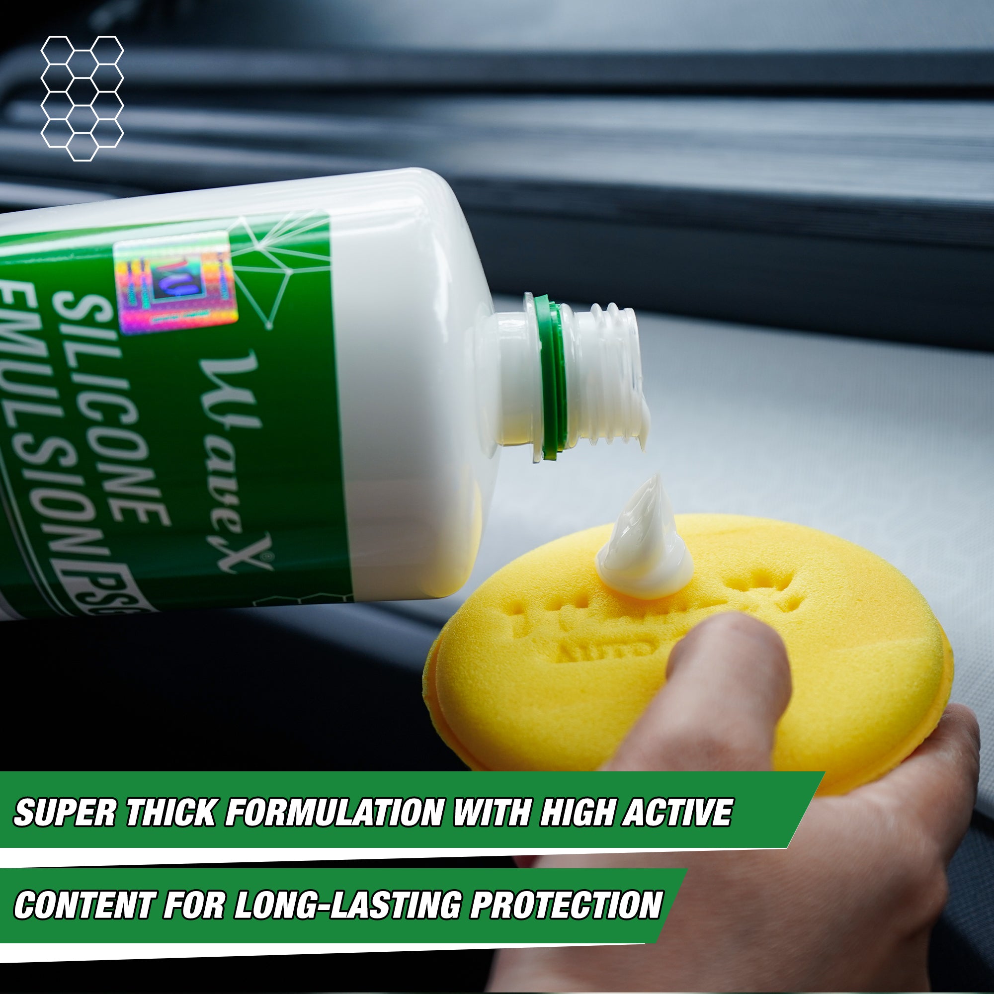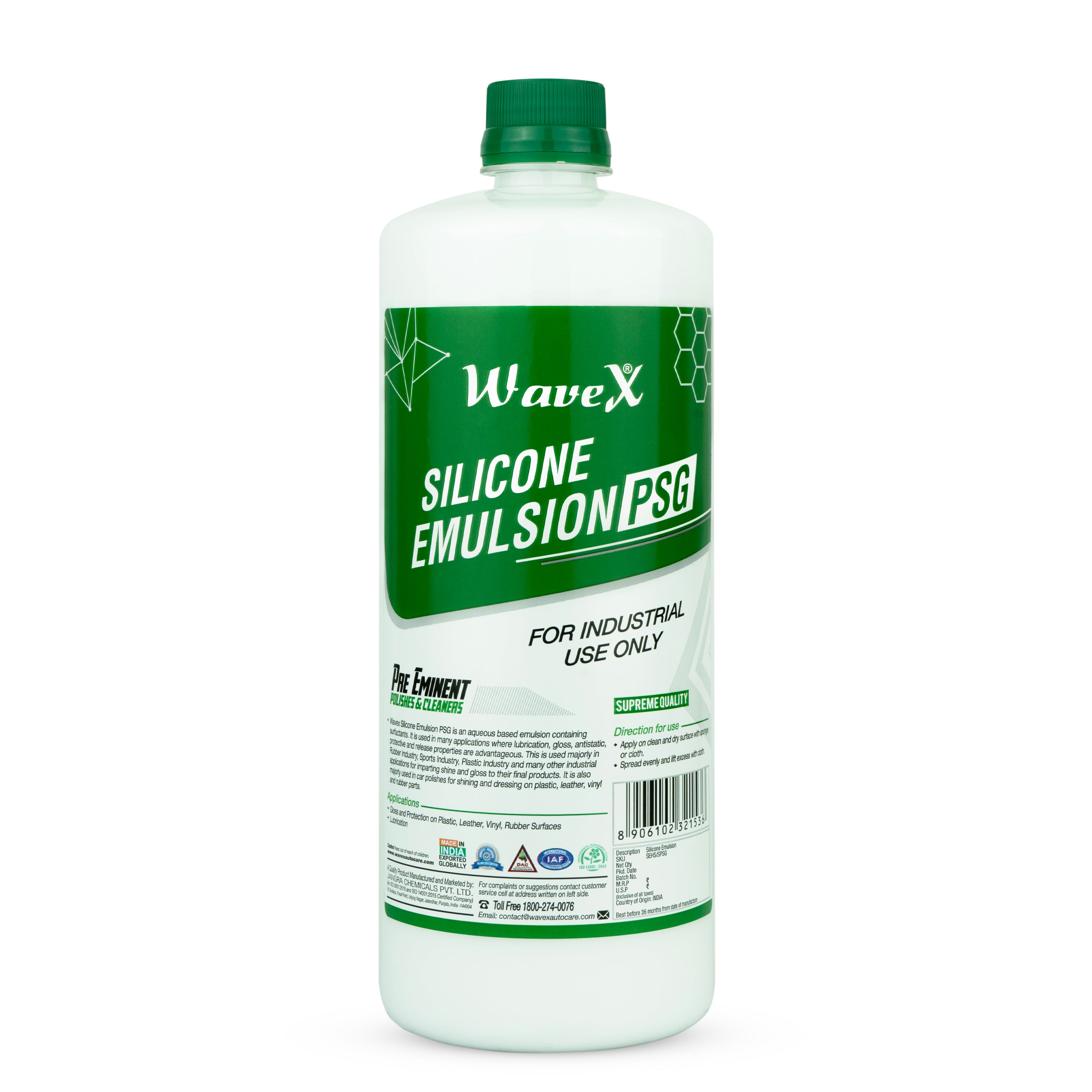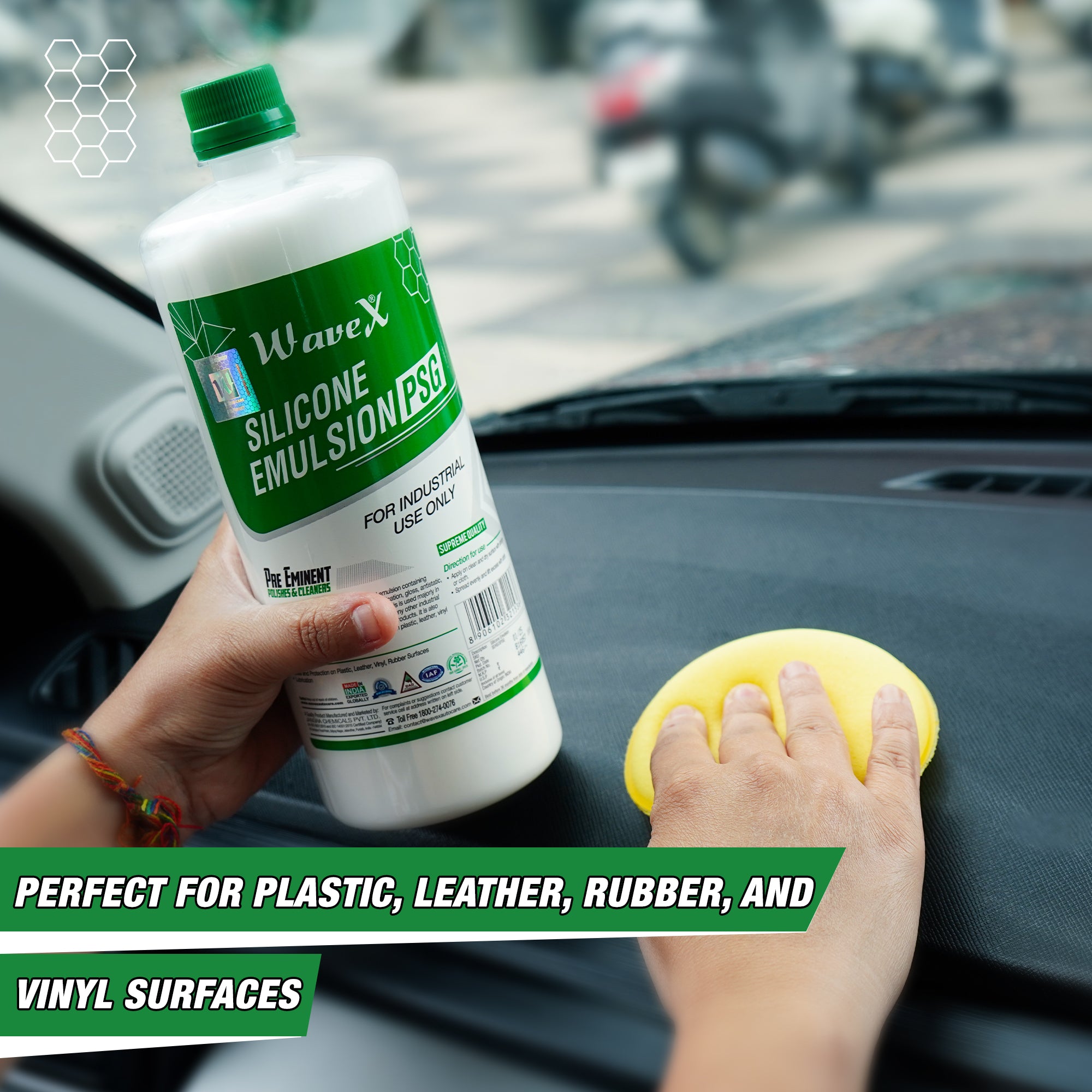 Wavex Silicone Emulsion 1Kg is a high-performance, water-based silicone dressing specially designed for multi-surface use, making it one of the most versatile products in car care, household maintenance, and industrial applications. Its super-thick, high active content formulation ensures long-lasting shine, protection, and conditioning for plastic, leather, rubber, and vinyl surfaces. Unlike ordinary dressers, this premium silicone emulsion can be diluted with water to achieve the desired concentration, offering exceptional economy and flexibility for different applications. Perfect for automotive interiors and exteriors such as dashboards, trims, leather seats, rubber mats, tyres, and vinyl components, it also works effectively on household furniture, gym equipment, agricultural tools, marine accessories, sports gear, footwear, electronic appliances, outdoor furniture, and more. Safe, non-toxic, and eco-friendly, Wavex Silicone Emulsion 1Kg is easy to apply—just spread evenly with an applicator or cloth and wipe off for a clean, polished, and protected finish. Whether you’re a professional detailer, industrial user, or home enthusiast, this silicone emulsion delivers unmatched performance and durability across all applications.