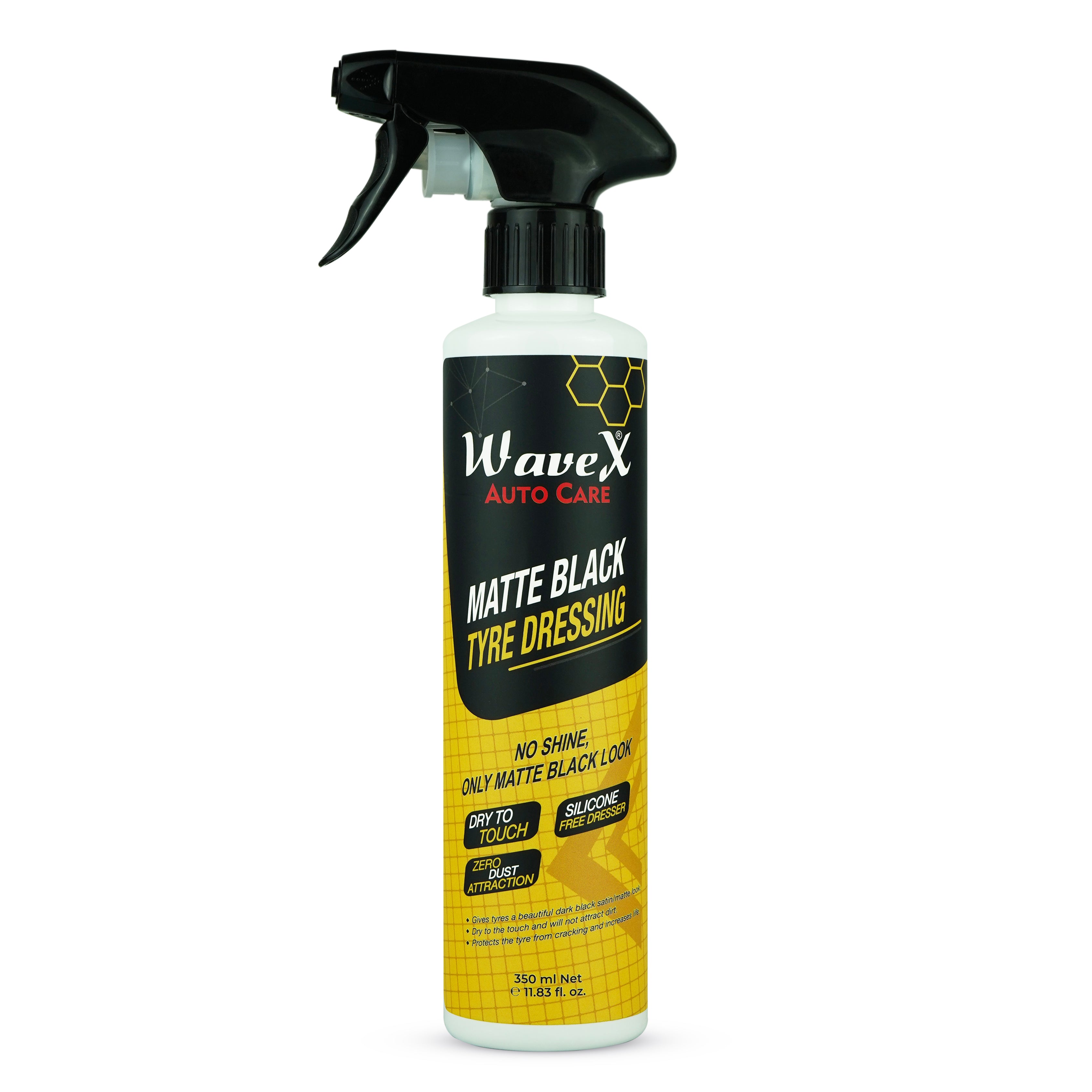Wavex Matte Black Tyre Dressing is a premium tyre polish designed to give car and bike tyres a deep, rich matte finish while protecting them from fading, cracking, and discoloration. Unlike ordinary silicone-based tyre polishes that leave a greasy shine and attract dust, this advanced formula provides a dry-to-touch, long-lasting, dust-repellent layer that instantly rejuvenates tyres and keeps them looking brand new for weeks. Easy to use, simply clean and dry the tyres, spray the dressing, and spread evenly with a Wavex Foam or Microfiber Applicator Pad, wiping away any excess with a microfiber towel if needed. Its protective lubricating agents not only restore tyres but also extend their life, making it the perfect choice for enthusiasts and professionals who want natural-looking, long-lasting results without the hassle of frequent tyre replacements.